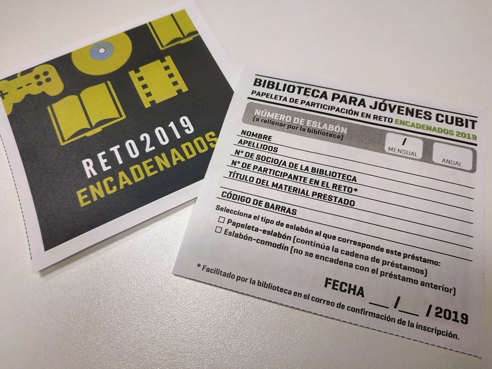 Así nace la propuesta de la biblioteca para este año, el reto ‘Encadenados’. Cubit propone a sus usuarios la creación de una enorme cadena de préstamos, una cadena cuyos eslabones sean los materiales de la biblioteca. La única premisa en este caso es que el material comience tal y como termine el anterior. Es decir, el usuario puede llevarse a casa en préstamo un material de la biblioteca cuyo título comience tal y como termine (última sílaba) el título del último material que se ha llevado. Se puede con cualquier material disponible (libros –novela, poesía, cómic, biografías, publicaciones sobre distintas materias, revistas, películas, series de televisión, música, videojuegos…).
